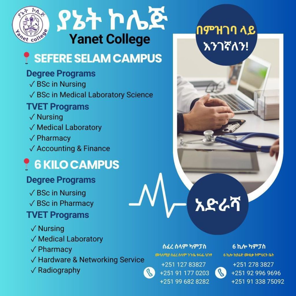 Yanet College is a higher education institution located in Addis Ababa, Ethiopia. Established in August 2007 G.C., the College was among the pioneering institutions offering Technical and Vocational Education and Training (TVET) programs in the country. In line with its mission to expand access to quality higher education, Yanet College introduced Bachelor of Science (BSc) degree programs in Nursing, Medical Laboratory Science, and Accounting and Finance in 2015 G.C. at its Sefer Selam Campus.